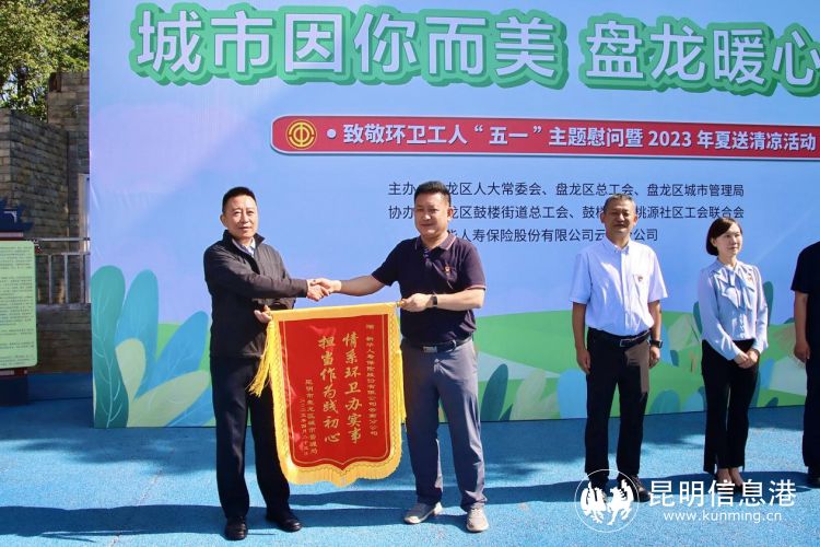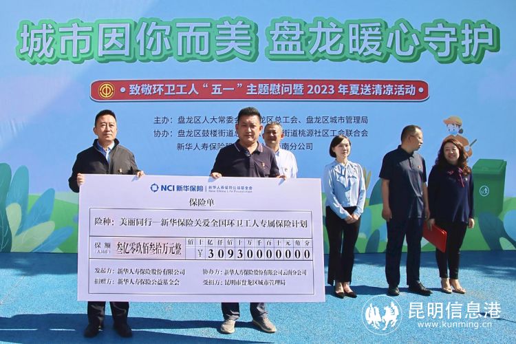昆明信息港讯 记者昝娟娟 4月23日上午,以“城市因你而美 盘龙暖心守护”主题的致敬环卫工人“五一”主题慰问暨2023年夏送清凉活动在桃源广场举行,同时,“城市因你而美·新华伴你而行——新华保险关爱全国环卫工人大型公益行动”也连续六年走进云南昆明。