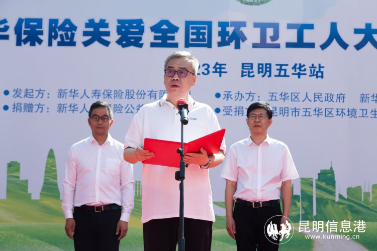 五华区人大常委会主任赵志良致辞并向新华保险赠送锦旗。他表示,长期以来,新华保险积极履行社会责任,在公益慈善事业、社会建设、民生改善方面作出积极贡献。今天,新华保险和新华人寿保险公益基金会再次把对环卫工人的爱和保障送到了美丽的春城,也彰显了世界500强企业的社会责任与担当。我们对新华保险和基金会表示衷心的感谢,向他们的无私情怀与奉献精神致以崇高的敬意。