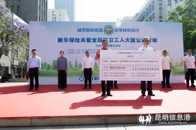 昆明信息港讯 记者昝娟娟 “同新聚力,卫爱出发”。4月25日上午,“城市因你而美·新华伴你而行——新华保险关爱全国环卫工人大型公益行动”昆明五华站捐赠仪式在昆明南屏步行街中心广场举行。新华保险向昆明市五华区2200余名环卫工人,捐赠每人10万元保额的人身意外伤害保险,捐赠总保额超2.2亿元。