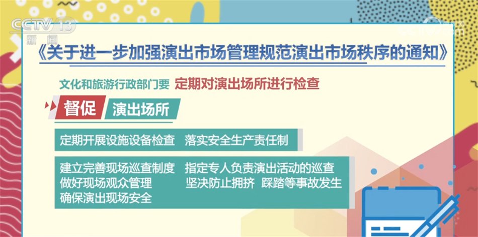 通知指出,各地文化和旅游行政部门要依法做好演出活动的审批工作,将属于营业性演出范围的农村集镇演出、流动性演出纳入审批管理,严格审核演出举办单位的资质文件,统一审批要求,做好内容监管。对不符合法定审批要求的,坚决不予批准。文化和旅游行政部门要定期对演出场所进行检查,督促演出场所定期开展设施设备检查,落实安全生产责任制。督促演出场所建立完善现场巡查制度,指定专人负责演出活动的巡查,做好现场观众管理,坚决防止拥挤、踩踏等事故发生,确保演出现场安全。各地文化和旅游行政部门要将社会关注度高、票务供需紧张的营业性演出作为重点监管对象,提前进行研判。督促演出举办单位、演出票务经营单位面向市场公开销售的营业性演出门票数量,不得低于核准观众数量的70%。对在票务经营中发现有炒票问题或可能造成不良影响的,应当及时约谈演出举办单位和演出票务经营单位,督促整改。要联合属地公安、市场监管等部门,依法打击“黄牛”炒票、虚假宣传等违法违规行为,切实保障消费者合法权益。