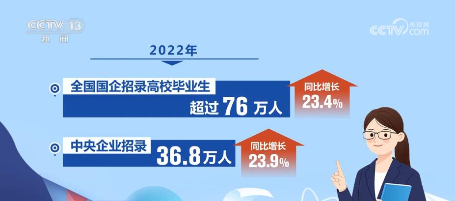 2022年,全国国企招录高校毕业生超过76万人,同比增长23.4%。其中,中央企业招录36.8万人,同比增长23.9%。今年,国务院国资委将继续推动国有企业做好稳就业相关工作。
