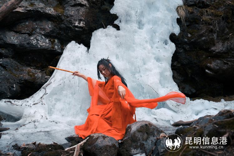 虽已入夏,轿子山背阴处的溪流瀑布还没完全解冻,一挂又一挂的“冰瀑”挂在林原沟壑、悬崖峭壁之中,似凝固的旋律,淡蓝的冰柱冰爪、冰花冰帘,宛如巨大的汉白玉雕塑,形态万千。
