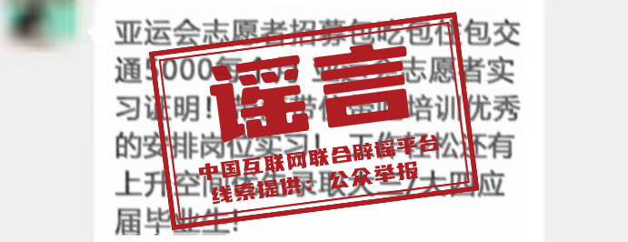 真相:近日,关于“亚运会志愿者招募,包吃包住带薪”的信息在网上流传。对此,第19届亚运会组委会发布紧急公告,表示杭州亚运会、亚残运会赛会志愿者招募工作由杭州亚组委负责,报名工作已于2022年12月31日结束。其他任何企业、组织或个人以招募杭州亚运会、亚残运会赛会志愿者名义发布的招募活动信息均为虚假信息。同时,赛会志愿者招募过程中不会向志愿者收取报名费、培训费、交通费等任何费用,服务期间不发放工资。请各界人士谨慎辨别,避免上当受骗。(来源:杭州2022年第19届亚运会官网)