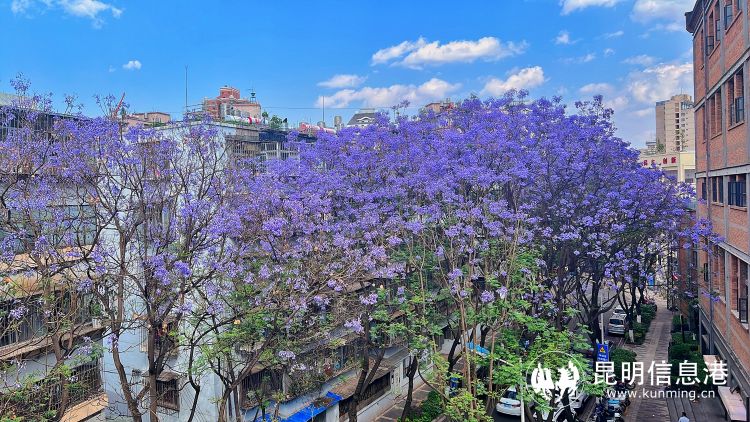 昆明信息港讯 记者李莹 “东君若待归春邑,一夜蓝花开满城”。 每年春末夏初,自带“梦幻蓝紫”滤镜的蓝花楹就是昆明城中的绝对主角。眼下,昆明西山区铁皮巷沿路的蓝花楹已是盛放如蓝紫焰火。4月27日,西山区金碧街道“春艺ON燃·蓝花楹开·幸福金碧”文化节活动启动,彩云里A栋3楼蓝花楹露台同期免费开放,市民与游客可在此零距离观赏蓝花楹盛放景致。