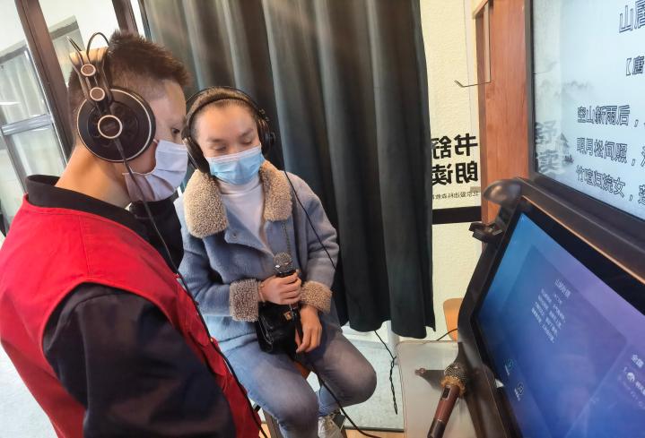 2022年10月14日,在山东省光明之家盲人数字图书馆,盲人读者体验“朗读亭”。新华社记者 袁敏 摄
