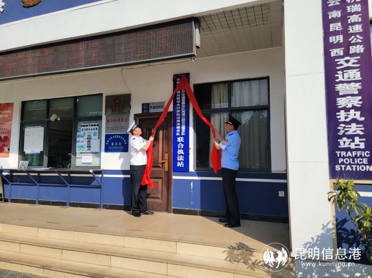 省交通运输综合行政执法局昆明支队组建工作组领导朱军龙、省公安厅交通警察总队高速公路交巡警支队副支队长杨杰一同为执法站揭牌。昆明支队相关科室负责人、涉及路段的交通警察大队和交通执法大队的相关人员参加了揭牌仪式。
