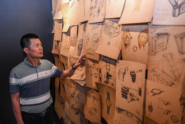 4月25日,在位于深圳的飞亚达钟表大厦,刘中华介绍展厅展示的各款手表手稿。新华社记者 毛思倩 摄