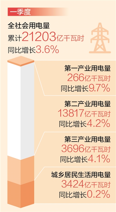 中国电力企业联合会有关负责人介绍,今年一季度,工业和制造业当月用电量增速高于全社会平均水平。全国工业用电量超1.36万亿千瓦时,同比增长4.4%,占全社会用电量的比重为64.2%。制造业中,四大高载能行业用电量合计5657亿千瓦时,同比增长4.2%;高技术及装备制造业用电量2113亿千瓦时,同比增长4%;消费品制造业用电量1207亿千瓦时,同比下降1.7%;其他制造业行业用电量1136亿千瓦时,同比增长5.2%。