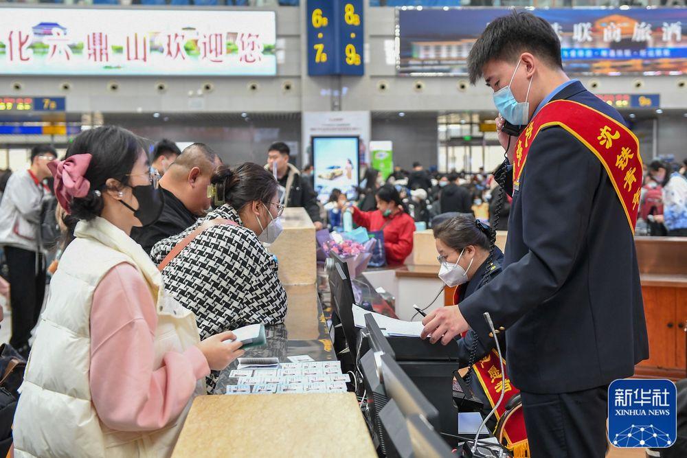 ↑4月29日,长春站候车大厅的工作人员解答旅客问询。新华社记者 张楠 摄