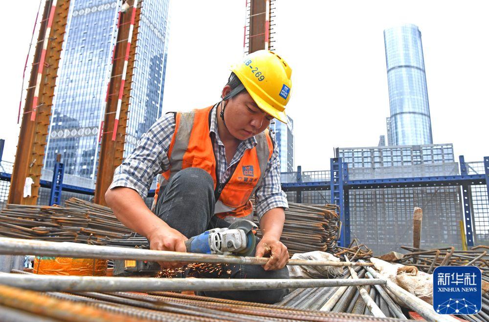 ↑4月29日,工人在广西南宁市良庆区中建三局一公司南宁中银金融中心项目建设工地切割钢管。新华社记者 周华 摄