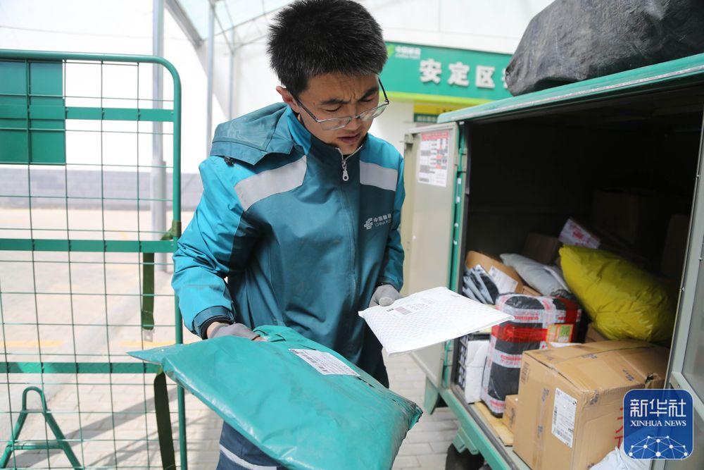↑4月29日,在甘肃省定西市,一名邮递员在装运快件。新华社发(王克贤摄)