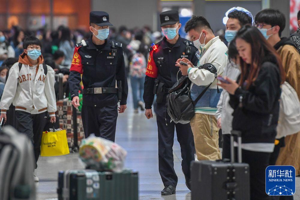 ↑4月29日,长春铁路公安处民警在长春站候车大厅执勤。新华社记者 张楠 摄