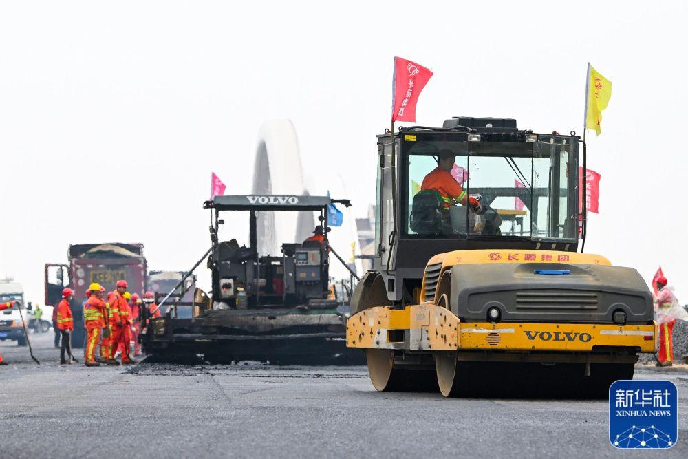 ↑4月29日,建设者在江苏省昆山市同丰大桥进行沥青摊铺施工。新华社发(王须中 摄)
