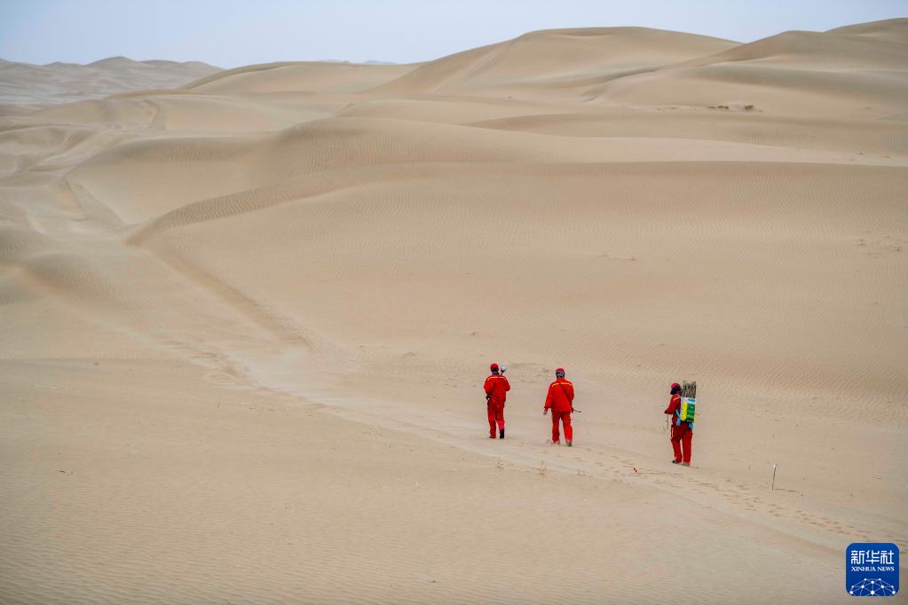 东方地球物理公司新疆塔里木物探处的工人冯永生(前)、冯双生(中)、冯志鹏在沙漠中进行测量定位,标记钻井点(2021年2月25日摄)。