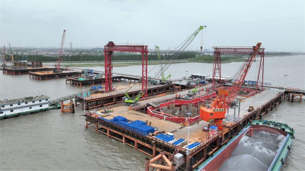 空中俯瞰,97根桩基宛如梅花桩,整齐笔挺屹立于江面。4月15日,世界在建最大跨度钢箱梁悬索桥张靖皋长江大桥的关键工程——南航道桥南主塔桩基施工完成。