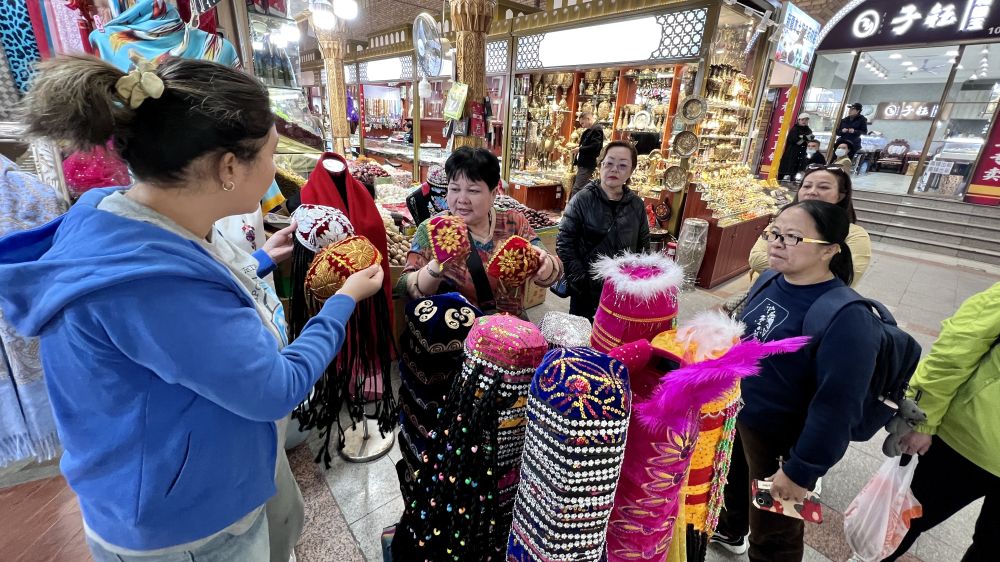 4月24日,新疆国际大巴扎景区商家给游客介绍维吾尔族花帽。新华社记者周晔/摄