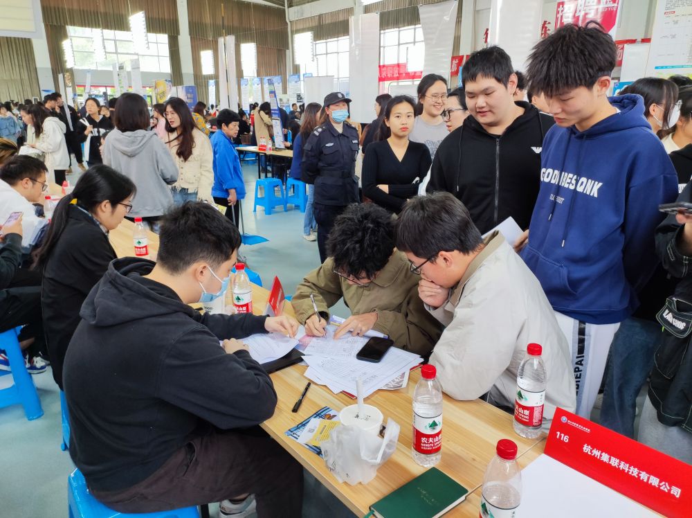 走进浙江经贸职业技术学院校园招聘现场,拿着简历的学生在各企业招聘点来往穿梭。