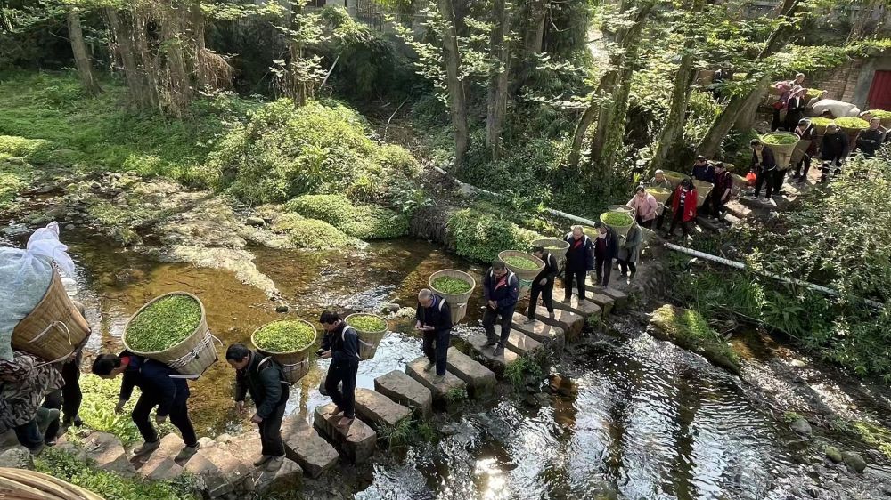 4月13日,雅安市名山区红星镇茶农背着鲜叶去市场销售。新华社发(彦戈/摄)