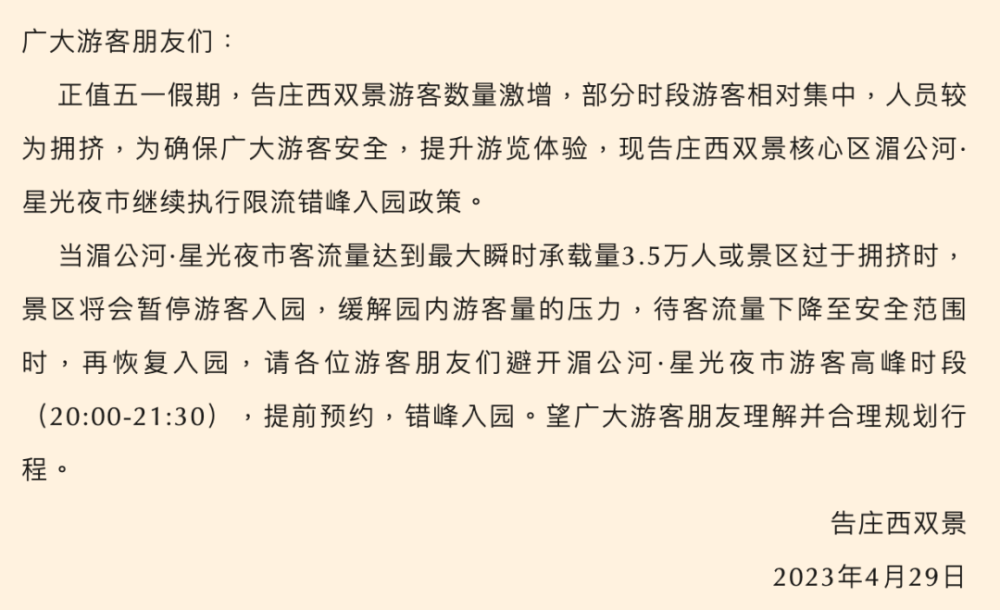 4月29日,西双版纳告庄西双景发布温馨提示,对湄公河·星光夜市继续执行限流错峰入园政策。