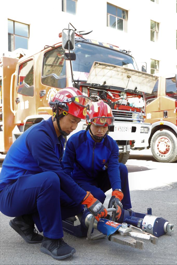 新华社西宁5月1日电 “出发时撒一条,跑动中接一条,两条消防水带连接时,接口要对准,听到‘咔嚓’声才算接好。一定要多练苦练,才能在黑暗环境下做到盲操……”日前,在青海省西宁市城西区西川南路消防救援站,站长助理玛尼坚戴着头盔,向队员讲解、演示消防水带的使用要领。