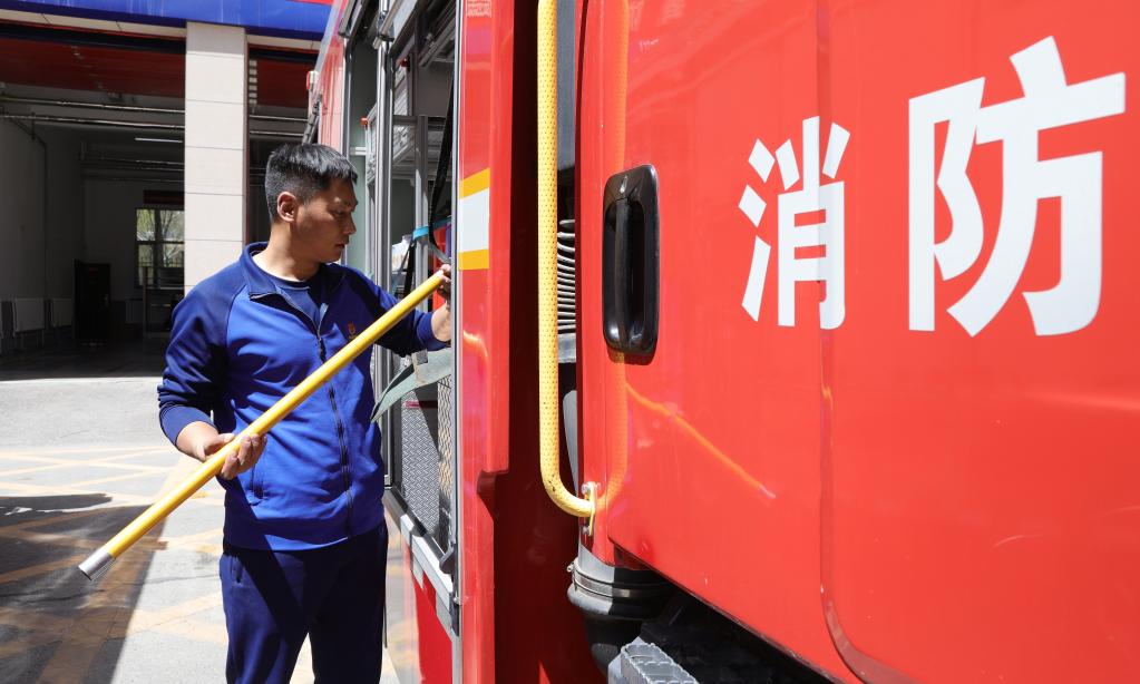 4月26日,玛尼坚在消防救援站进行救援车辆装备日常维护。新华社记者赵玉和 摄