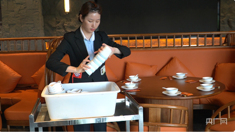 餐厅服务员在摆放餐具(央广网记者 昌思荣/摄)