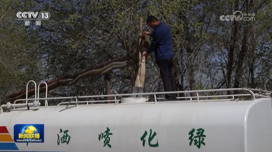 在甘肃八步沙林场,曾经寸草不生的沙漠被嫩绿的沙生植物所覆盖。眼下,林场职工正抓住时机,为今年新栽的树苗浇“安苗水”。