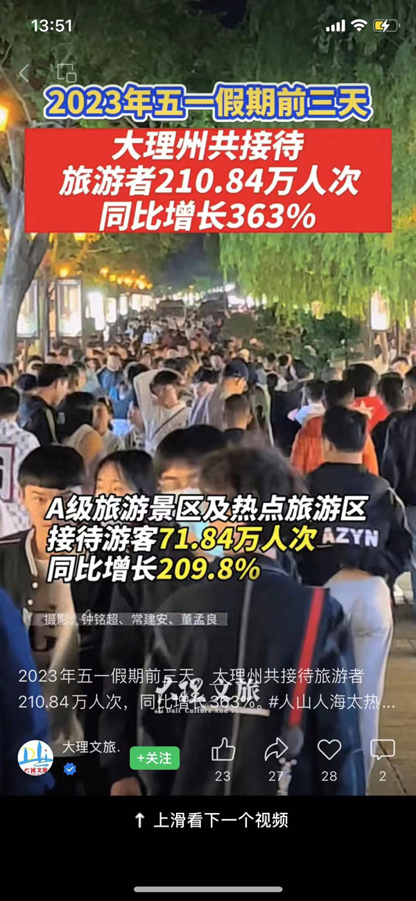 记者从大理州文化和旅游局了解到,2023年五一假期前三天,大理州共接待旅游者210.84万人次,同比增长363%;A级旅游景区及热点旅游区接待游客71.84万人次,同比增长209.8%。同时,5月2日下午,记者从游云南APP上实时视频看到,五一期间的大理各个景区、景点游人如织,秩序井然。