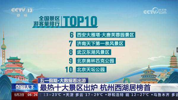 而就在今天,大理古城也登上了央视新闻。据央视新闻5月2日消息4月29日零时至5月1日16时全国游客量排前十的景区分别为:
