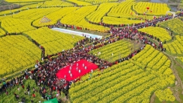 5月3日,在湖北省宣恩县彭家寨古吊脚楼前,游客与村民同跳土家“摆手舞”。新华社发(宋文摄)