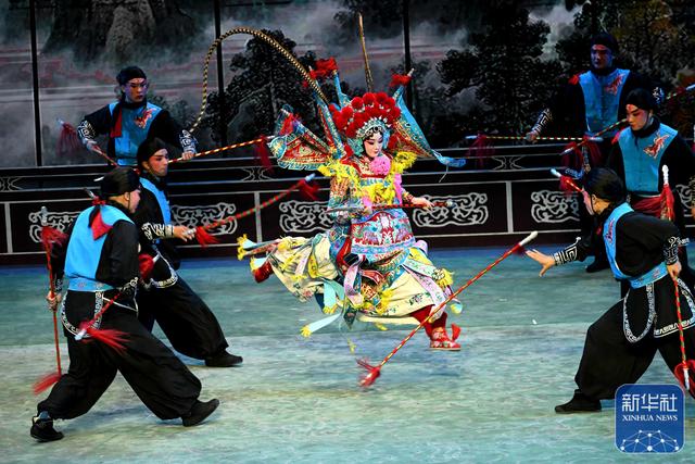 5月2日晚,河南省豫剧院青年团的演员表演豫剧《穆桂英大破天门阵·破天门》选段。新华社发(陈其保 摄)