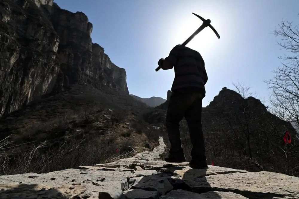 夕阳余晖下,苍凝深邃的太行山深处,躬身修路的汉子们被勾勒成一幅黑白剪影。这些大山的子孙们,在绝壁上凿出一条条出山“天路”,让村民们走了出去,也让外面的人走了进来。(张磊、詹彦)
