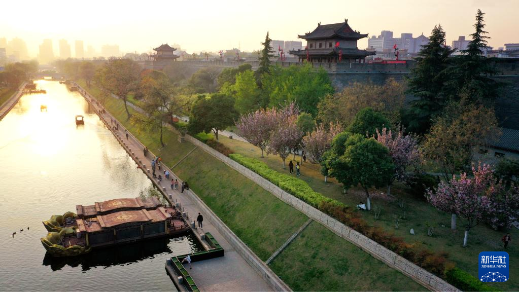 西安城墙西侧护城河(4月15日摄,无人机照片)。新华社记者刘潇/摄