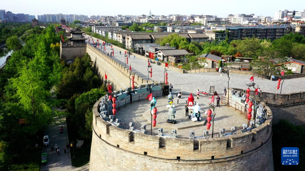 游客在西安城墙参观游览(4月30日摄,无人机照片)。新华社记者刘潇/摄
