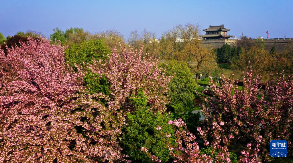 西安城墙掩映在繁花之中(4月1日摄,无人机照片)。新华社记者刘潇/摄