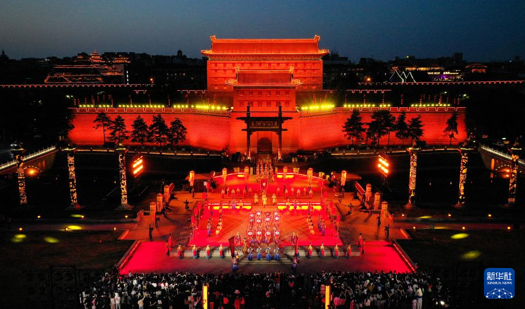 游客在西安城墙景区观看《梦长安——大唐迎宾盛礼》(4月30日摄,无人机照片)。新华社记者刘潇/摄