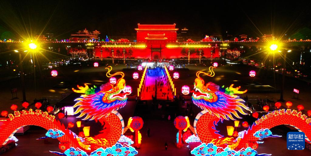 2023年春节期间西安城墙永宁门的花灯(1月26日摄,无人机照片)。新华社记者刘潇/摄
