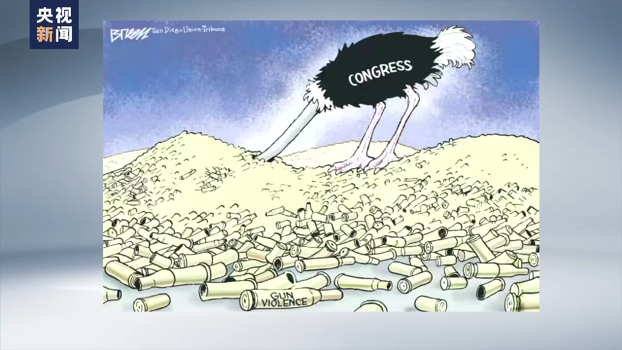这张漫画更加形象地描绘了美国枪支暴力的现状:画中,在“枪支暴力”的子弹堆上,象征美国国会的鸵鸟将头深深地埋入其中。