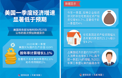 近日,美国商务部经济分析局数据显示,美国2023年一季度GDP年化环比增长1.1%,大幅低于市场预期的2%,较去年四季度2.6%的增幅有所回落,已连续两个季度放缓。《华尔街日报》网站报道称,在通货膨胀仍然高企、利率不断上升的情况下,美国第一季度经济增长下滑,增加了人们对今年晚些时候可能出现经济衰退的担忧。