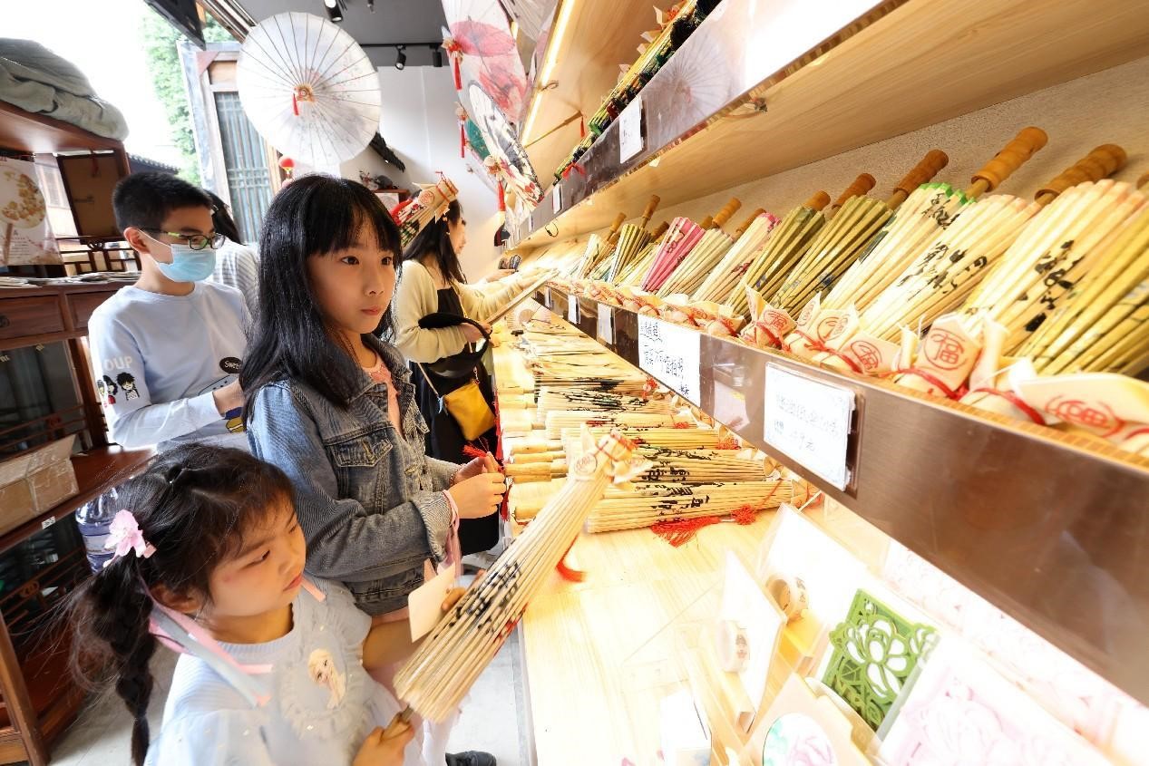 Tourists visit a gift shop at a tourist attraction in Fuzhou, capital of southeast China's Fujian province, May 2, 2023. (People's Daily Online/Wang Wangwang)
