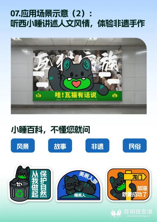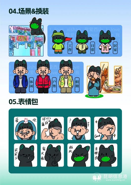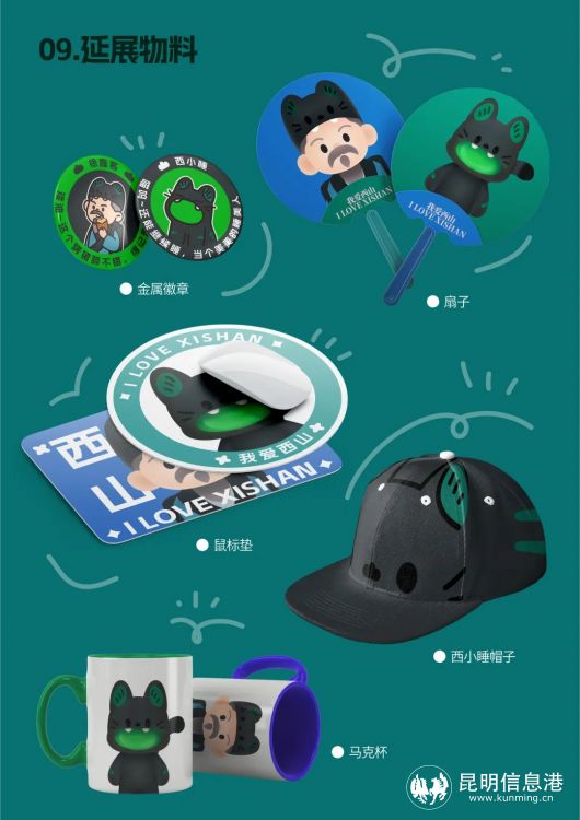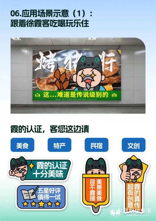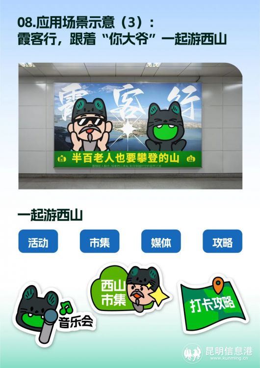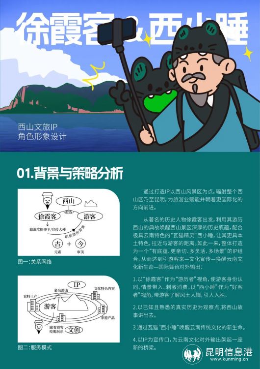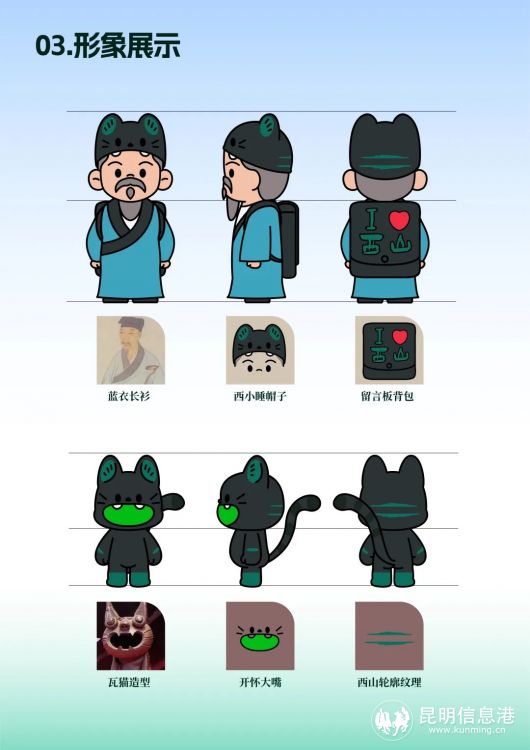 设计理念:作者吴建成是云南大学的一位学生,在云南大学的校歌中有写到西山和滇池,所以他一直对西山情有独钟,选择徐霞客和瓦猫作为形象主体,对其重新进行设计,赋予其新的文化内涵和传播意义。