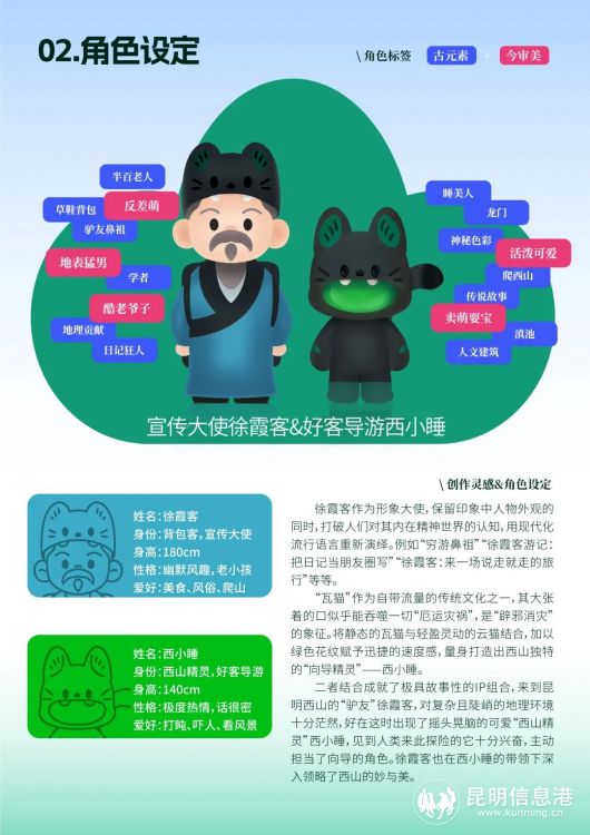 由于徐霞客是50多岁再次登上西山,留下了传奇的一笔,同时也是他人生最后的一次旅途,所以吴建成将徐霞客定位为50岁左右的老先生,并将其打造成了一个略带“萌”感的酷老头形象,迎合了互联网时代年轻人的喜好。而瓦猫原本就是云南知名IP形象,作者期望借助瓦猫和许侠客的强强联合,形成西山区乃至昆明市的旅游IP形象,希望通过比赛来将西山宣传出去,不光是让昆明和云南人知道,还要走出全国走向世界,让大家感受西山的魅力。