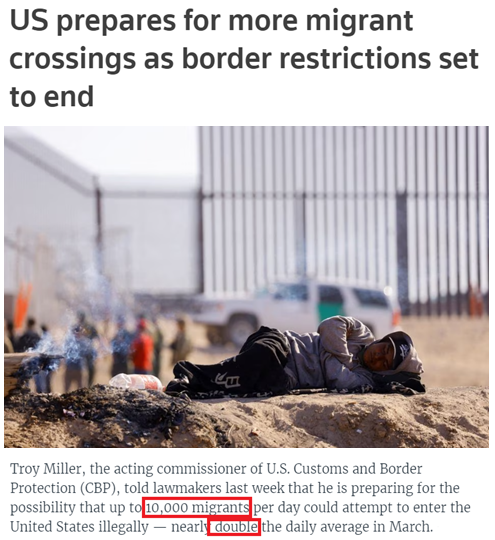 美国海关与边境保护局代理局长特洛伊·米勒近期在国会回应质询时说,5月11日以后,每天试图进入美国的非法移民可能多达1万人,比3月时的数字近乎翻倍。