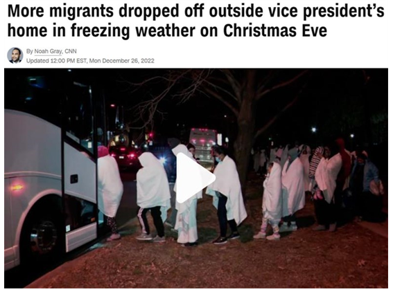 美国有线电视新闻网:去年年末西方传统节日前夜,被得州州长阿博特派客车一路北运的上百名拉美移民被扔在华盛顿特区的美国副总统哈里斯的官邸外,在刺骨严寒中瑟瑟发抖。