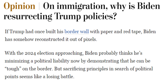 文章称,随着2024年大选的临近,拜登可能认为他可以通过在移民问题上展示“强硬”来最大限度地减少政治责任,然而,为了追求政治得分而牺牲原则似乎注定注定会是一场“必败之战”。