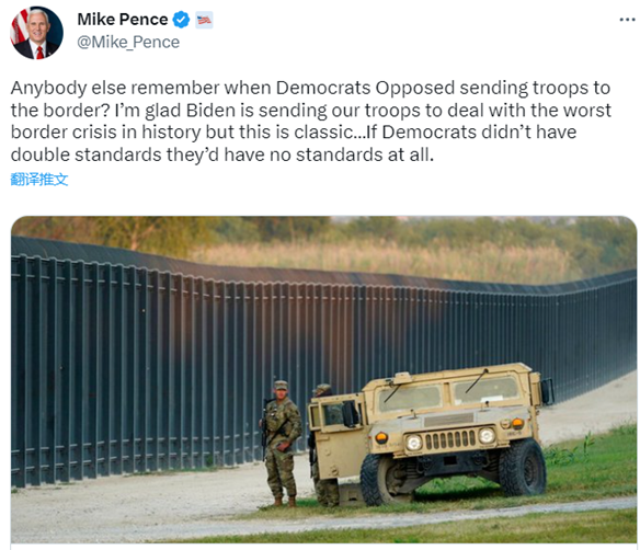 前副总统、共和党人彭斯在社交媒体发文挖苦说:“谁还记得民主党人(在2018年)曾坚决反对向边境派兵?民主党人不是‘双重标准’,他们根本就没有标准。”