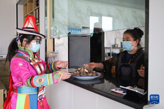 5月9日,在甘肃省张掖市肃南裕固族自治县大河乡西岔河村,裕固族村民在自家牧家乐为客人上菜。
