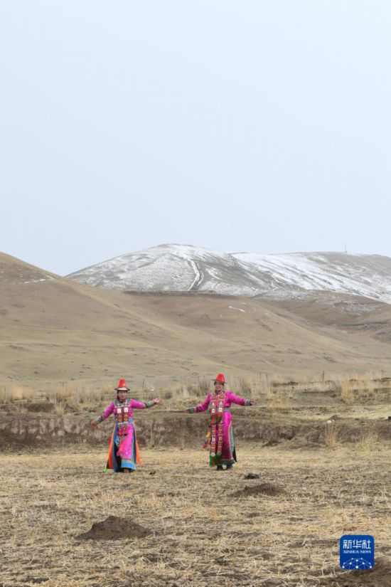5月9日,在甘肃省张掖市肃南裕固族自治县大河乡西岔河村,巴尔斯雪山脚下的裕固族村民排练民俗节目。