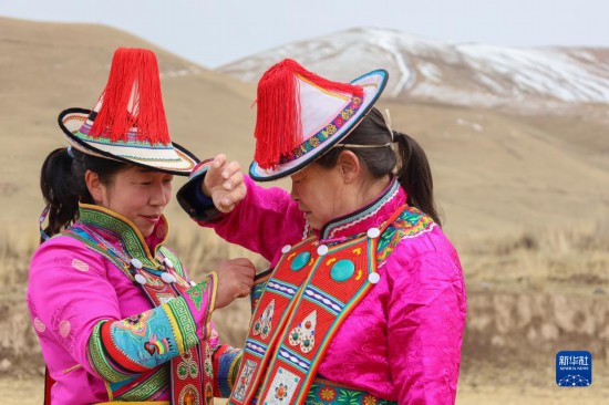 5月9日,在甘肃省张掖市肃南裕固族自治县大河乡西岔河村,巴尔斯雪山脚下的裕固族村民互相整理民族服饰。