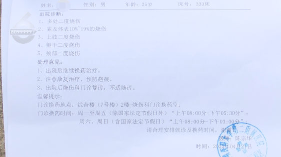 陈先生表示:“全身火辣地疼,就是钻心的那种疼,然后烧伤面积是10%到19%,脖子、后背、前胸这些地方,包括下巴这些,当时也被烧到。”